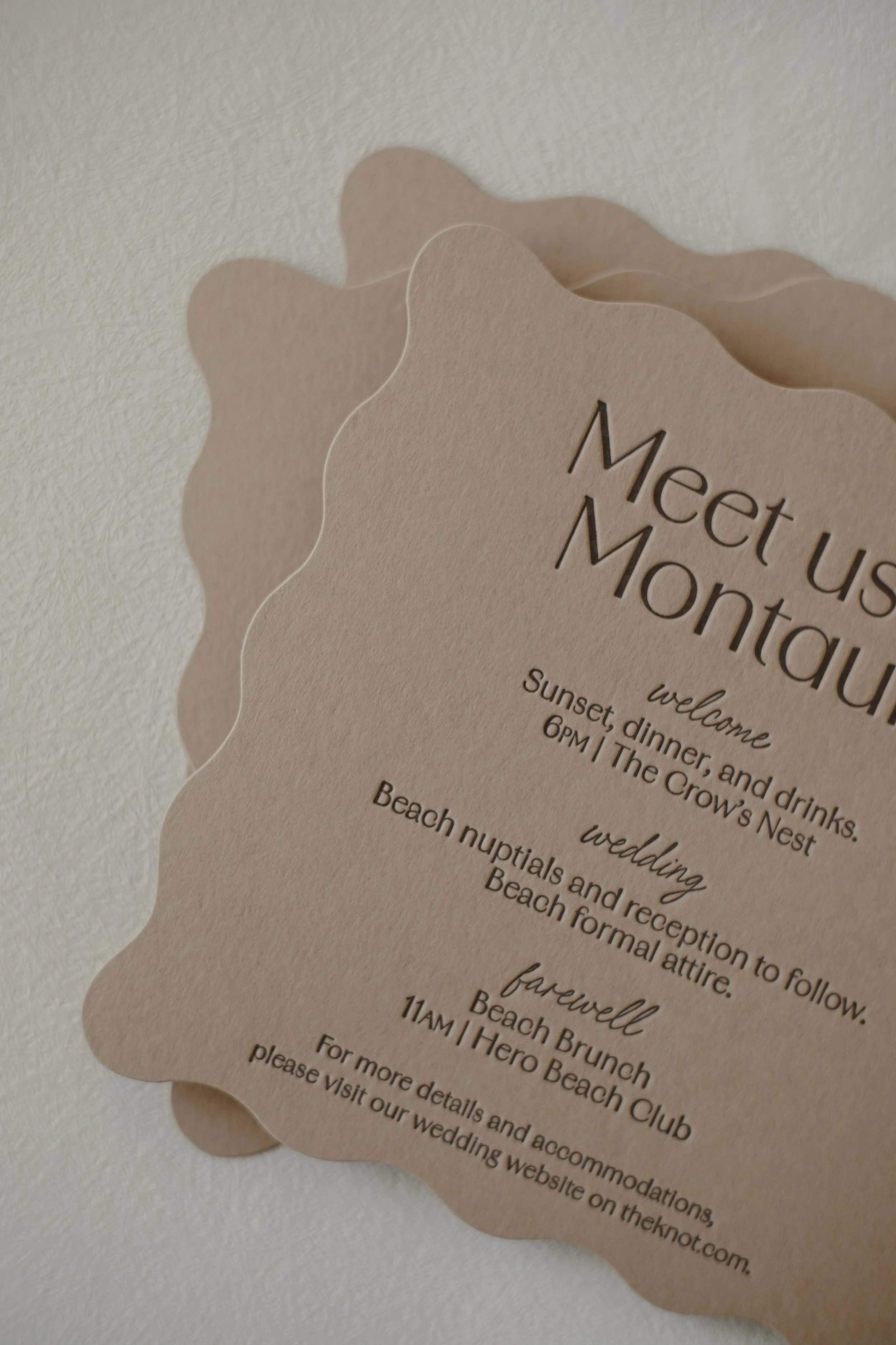 2. Details Card: 5.5”, 1-ply cardstock, 1-color letterpress design, with a die-cut wavy edge